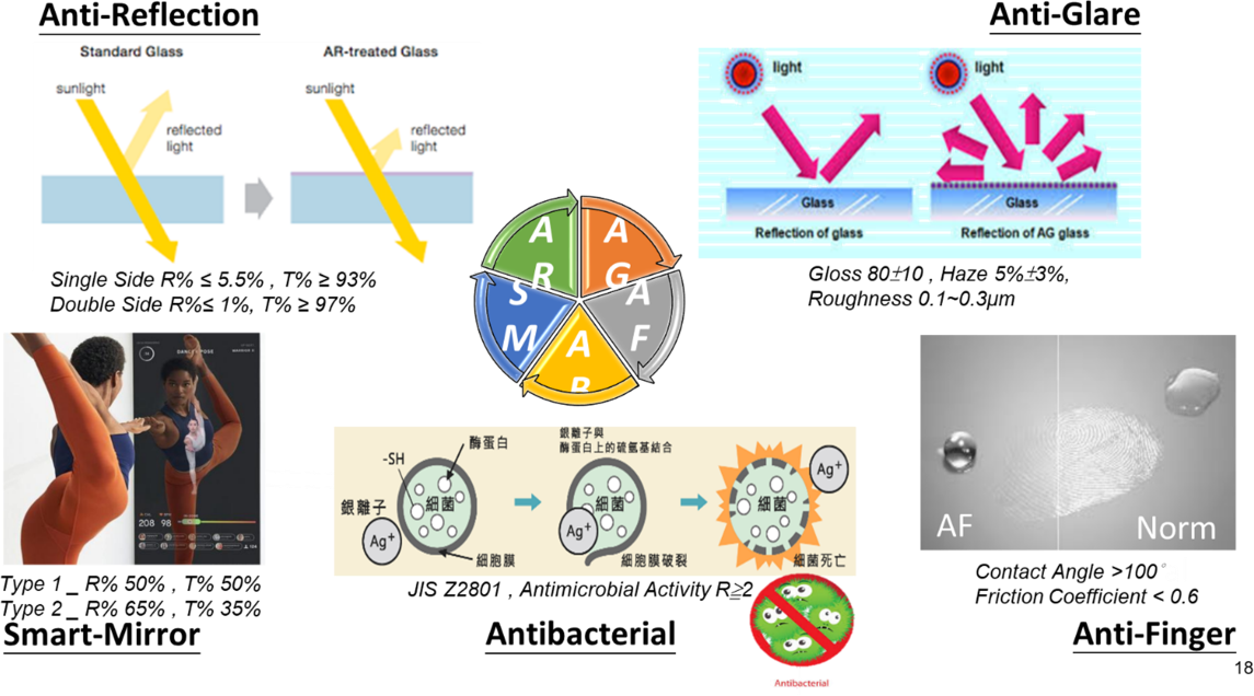 我们提供各种不同的表面处理, 包含抗眩光, 抗反光, 抗指纹以及镜面镀膜。因应疫情, 我们也提供触控屏幕表面的抗菌处理, 笔身抗菌处理以及非接触式的触控方案, 除了提供更多元的触控体验, 也减少了与病菌接触的机会!